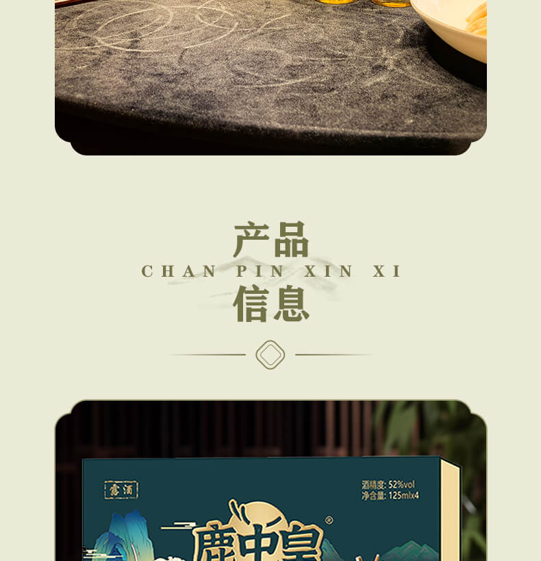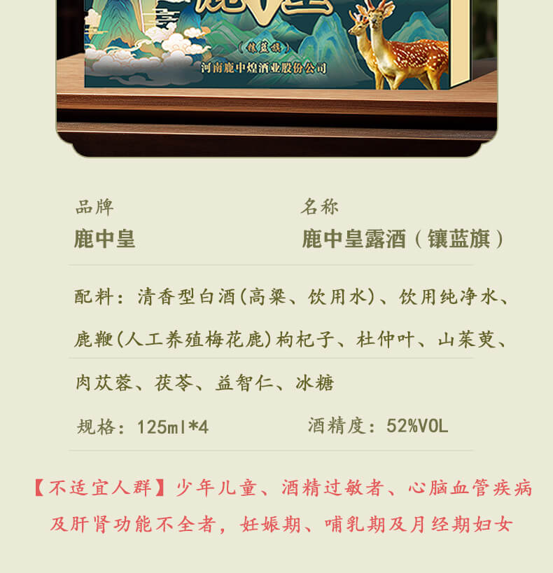| 品名 | 鹿中皇露酒(镶蓝旗) | 酒精度 | 52°vol |