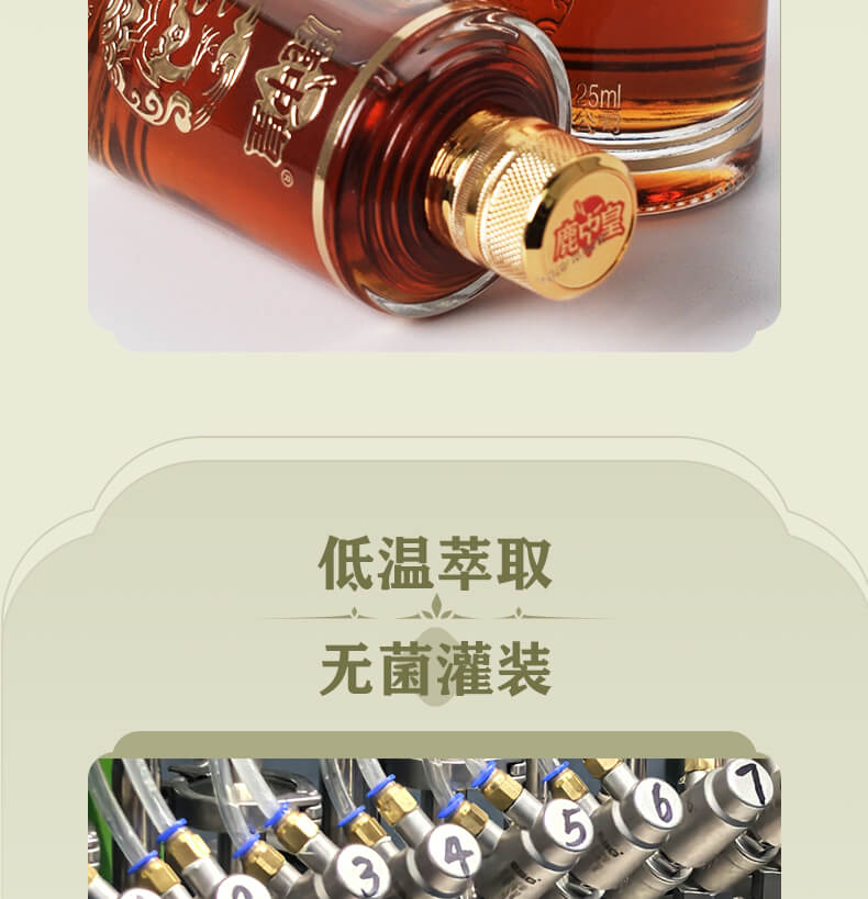 | 配料 | 清香型白酒(高粱、饮用水)、饮用纯净水、鹿鞭(人工养殖梅花鹿)枸杞子、杜仲叶、山茱萸、肉苁蓉、茯苓、益智仁、冰糖 | ||