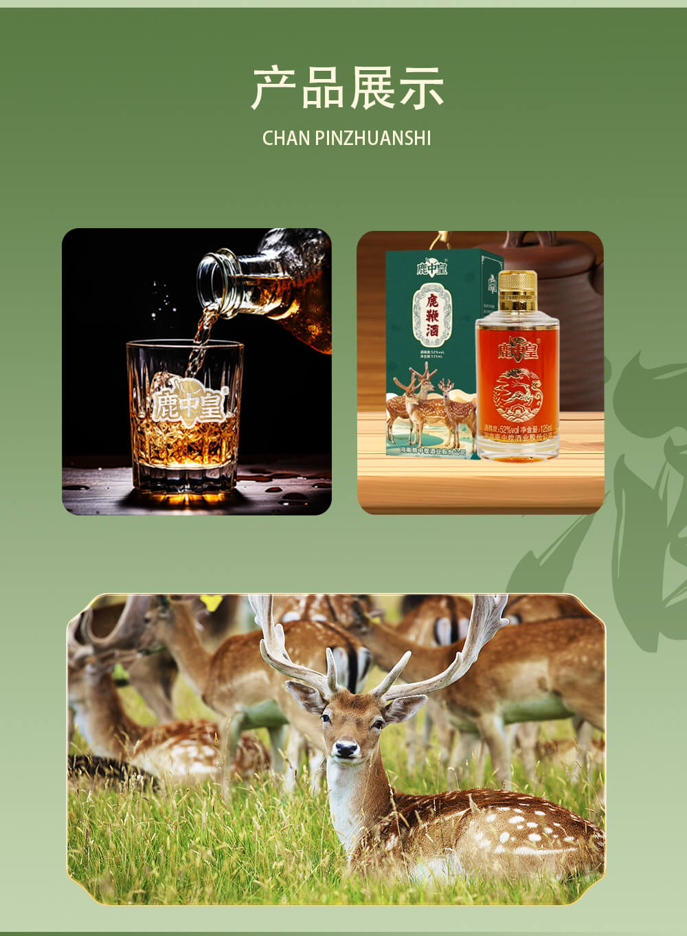 | 配料 | 清香型白酒(高粱、饮用水)、饮用纯净水、鹿鞭(人工养殖梅花鹿)枸杞子、杜仲叶、山茱萸、肉苁蓉、茯苓、益智仁、冰糖 | ||