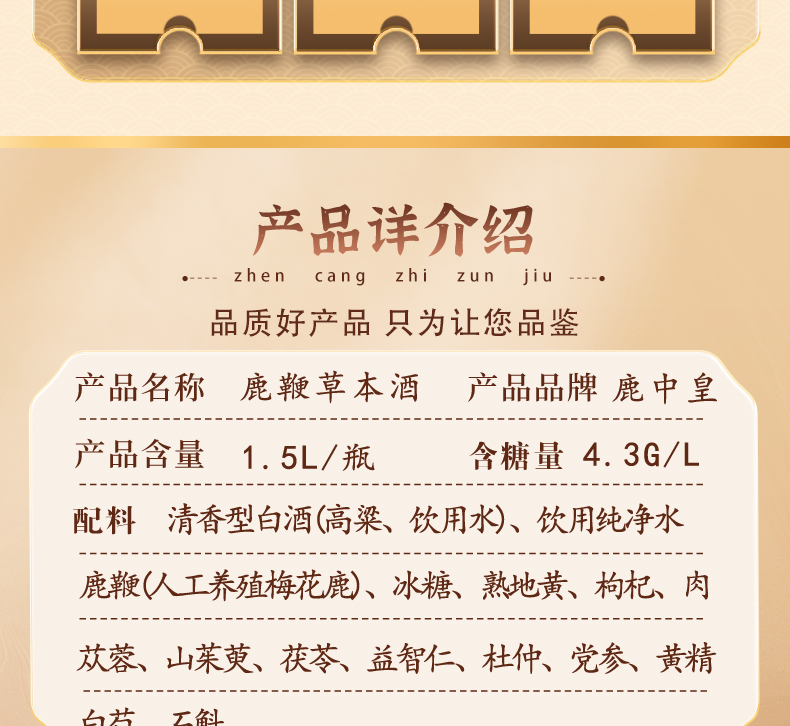 清香型白酒酿制,含人工养殖鹿鞭,黄金容量,自饮佳选。